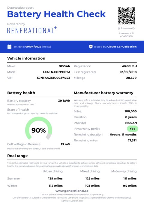 This automatic Nissan Leaf is a perfect introduction into electric motoring and is a fantastic city vehicle. It benefits from great battery health (90 percent health Certificate provided), very low mileage and impressive specification. This car will have a pre delivery inspection, a new 12-month MOT and a 12 month warranty.